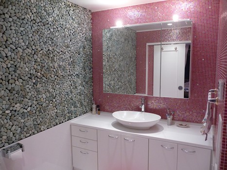 壁はモザイクタイル、一面のみ天然石のモザイクで仕上げています。